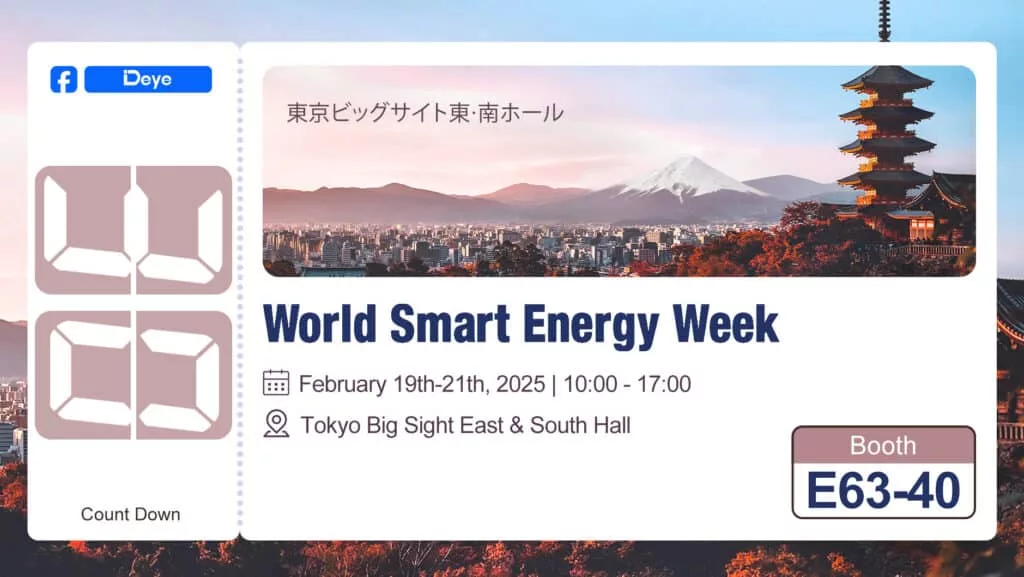 February 19-21, 2025 | Booth E63-40 Join us at Tokyo Big Sight East & South Hall, where we’ll be showcasing our latest smart energy solutions against the backdrop of iconic Mount Fuji. From 10:00 to 17:00 daily, our team will be demonstrating DEYE’s cutting-edge renewable energy technologies.